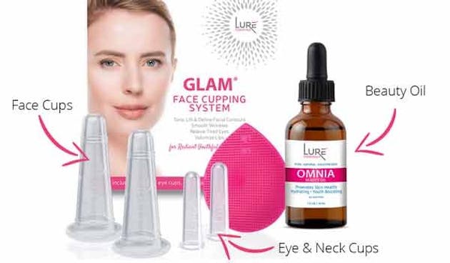 Lure Essentials Glam® Facial Cupping Set is the facial massage cupping kit of choice for high-end spas and dermatologists. It combines the ancient practice of cupping and a skin-nourishing facial oil full of omega fatty acids and vitamins to improve blood flow and rejuvenate your skin2. In just five minutes a day, 2-3 times a week, you can see noticeable results – like smoothing fine lines and wrinkles, reducing puffiness and tired eyes, and stimulating collagen product2 – which means tighter, brighter, younger-looking, skin!1